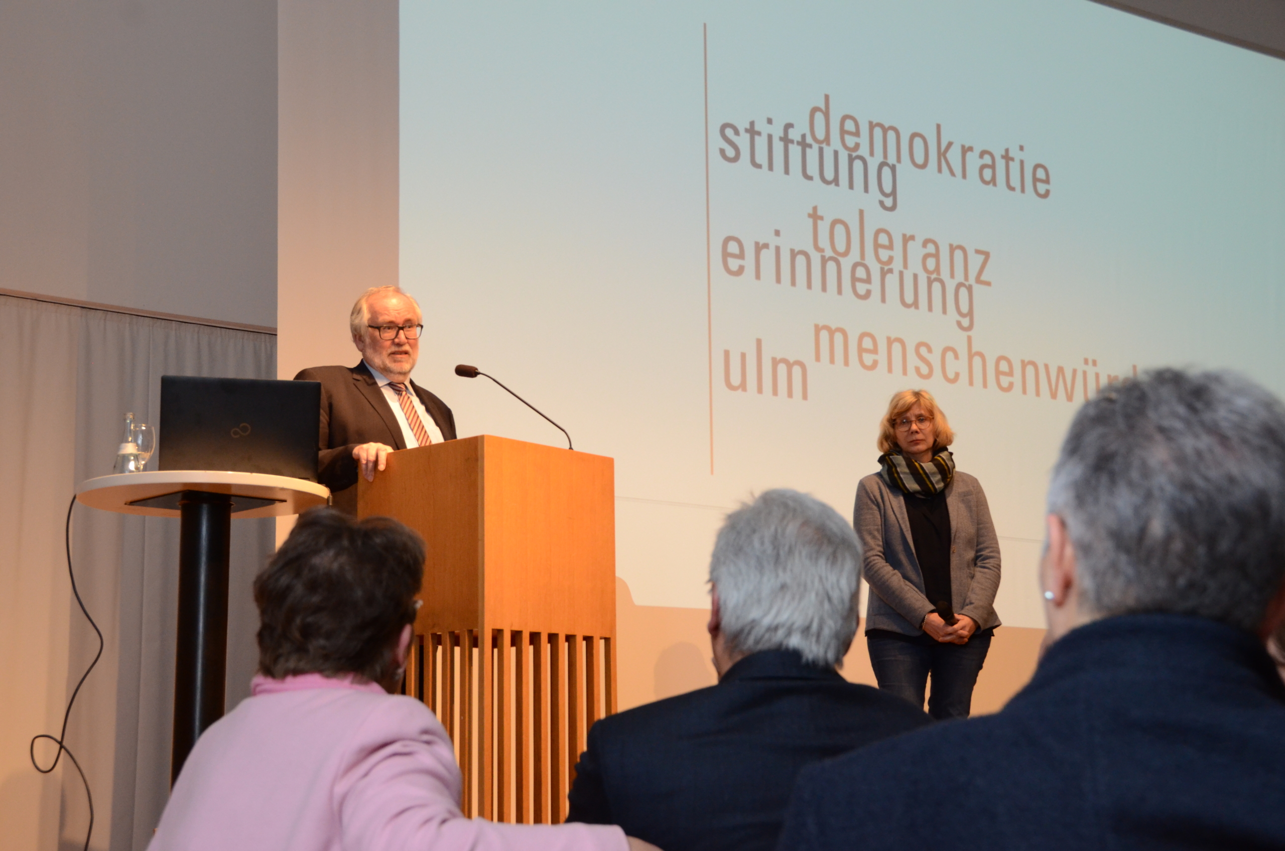 Am Dienstag, 14. Februar, um 19.00 Uhr wurde im Ulmer Stadthaus der 20. Jahrestag der Stiftung Erinnerung Ulm – für Demokratie, Toleranz und Menschenwürde begangen. Unter dem Titel „Mensch sein – ein künstlerischer Abend zum Thema Demokratie und Menschenrechte“ gab es einen Rückblick der scheidenden Stiftungsvorsitzenden Dr. Ilse Winter auf zentrale Stiftungsaktivitäten und ein Perspektivgespräch mit der neuen Vorsitzenden Elisabeth Zoll. Oberbürgermeister Gunter Czisch sprach ein Grußwort. Wichtiger Bestandteil des Abends waren Musik und Lesung zu den zentralen Themen der Stiftung. Die Konzeption hat Ehrenstiftungsrätin Sibylle Schleicher erarbeitet.